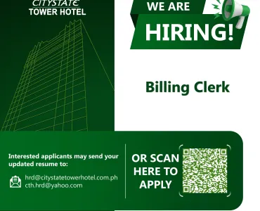 Citystate Tower Hotel is seeking a capable billing clerk who is ready to bring their expertise and enthusiasm to our vibrant team!